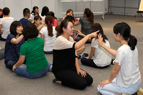 持参のポンポンで華やかさをイメージしながら、ダンスの合間には手あそびも楽しみました。